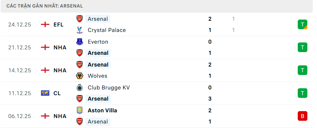 Phong độ đội Arsenal (5 trận gần nhất)