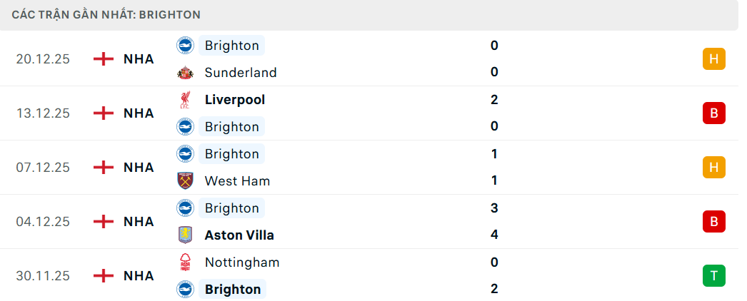 Phong độ đội Brighton (5 trận gần nhất)