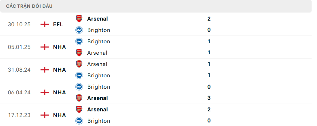 Lịch sử đối đầu (Head to Head) Arsenal vs Brighton