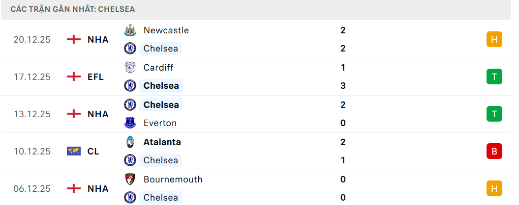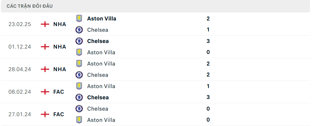Lịch sử đối đầu (Head to Head) Chelsea vs Aston Villa