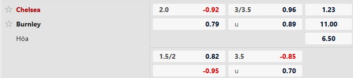 Điểm lợi nhuận cửa Chelsea thắng chỉ 1.23 nhưng vẫn thu hút được sự chú ý của giới túc cầu. Trước một Burnley đang rơi vào khủng hoảng, The Blues với đẳng cấp vượt trội và lợi thế sân nhà sẽ không mấy khó khăn để giành chiến thắng. Trực quan hơn, Chelsea vẫn là sự lựa chọn tối ưu ở hạng mục tỷ lệ kèo Châu Âu.