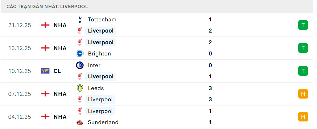 Phong độ đội Liverpool (5 trận gần nhất)