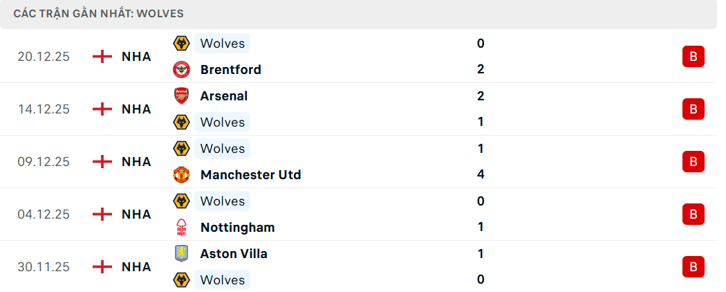 Phong độ đội Wolves (5 trận gần nhất)