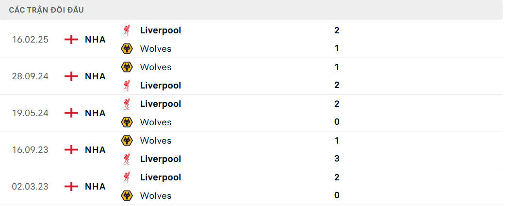 Lịch sử đối đầu (Head to Head) Liverpool vs Wolves