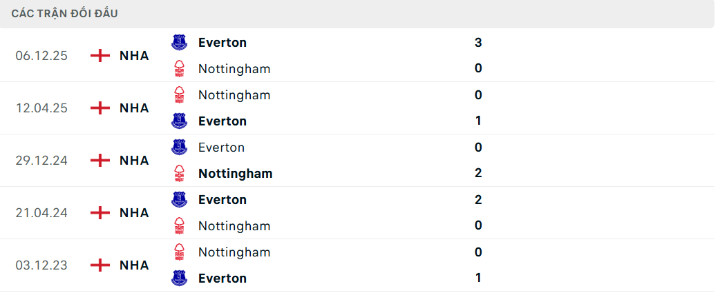 Lịch sử đối đầu (Head to Head) Nottingham vs Everton