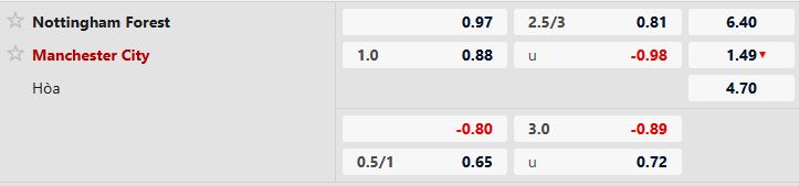 Tỷ lệ kèo Châu Á Man City chấp 1 hòa được ấn định thời điểm ban đầu gần như không dịch chuyển. Tuy nhiên, thang điểm lợi nhuận 2 đầu niêm yết lại có những biến động tương đối phức tạp. Theo đó, điểm ăn cửa trên đang sụt giảm tương đối nhanh và chốt ở mốc 0.95 khoảng 24 tiếng đồng hồ trước giờ bóng lăn. Điều này cho thấy sức bật mà Man City tạo ra là tương đối ấn tượng, đồng thời cũng là cơ sở để các chuyên gia soi kèo bóng đá Anh nhận định Man Xanh là điểm đầu tư đáng tin cậy ở cặp đấu Nottingham vs Man City.