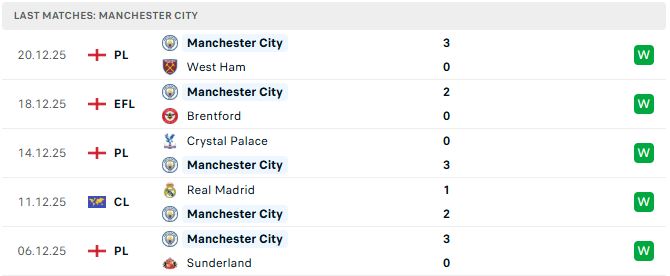 Liên tiếp 5 trận gần đây, Man City toàn thắng và đều là những trận thắng mang tính điểm nhấn. Trong đó, như đã đề cập đến, Man Xanh đánh bại Real Madrid ngay trên đất Tây Ban Nha tại Champions League, vượt qua Brentford 2-0 tại cúp Liên đoàn và 3 trận thắng ấn tượng trước Sunderland, Crystal Palace lẫn West Ham đều với tỷ số cách biệt đậm 3-0.