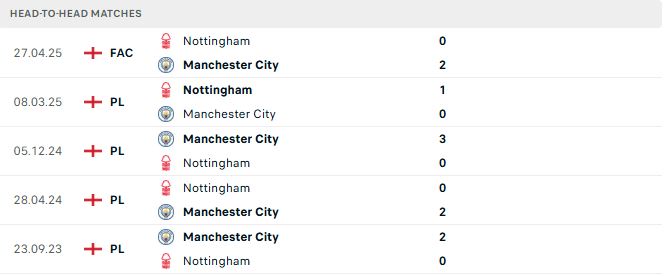 Lịch sử đối đầu (Head to Head) Nottingham vs Man City